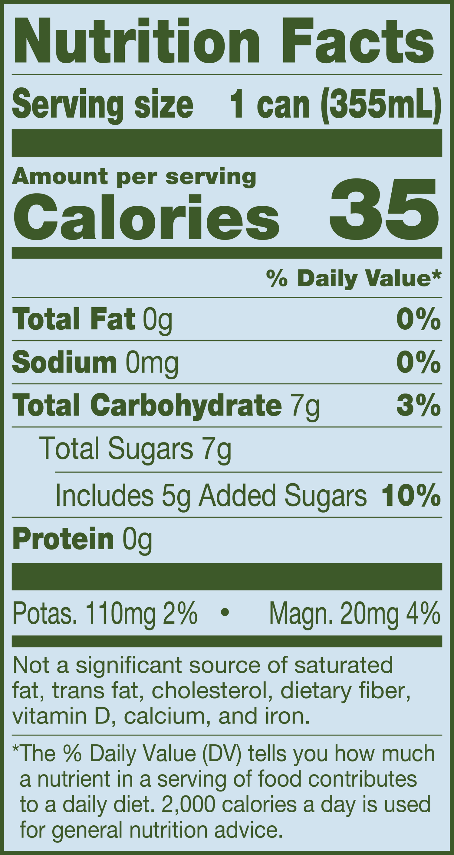 Carbonated Water, Mango Puree, Organic Cane Sugar, Mango Juice Concentrate, Natural Flavors, Citric Acid, Cascara Superfruit Energy (Coffea Arabica, L-Theanine), Electrolytes (Potassium Citrate, Magnesium Citrate).